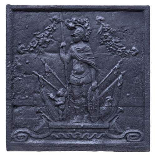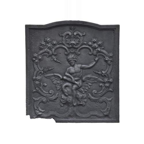 This fireback illustrate the farewell between the King of Spain, Philip V and the King of France, Louis XIV. A ribbon with the inscription "The farewell of the King of Spain with the king of France" describes the scene. The young King of Spain is steping out of a carriage, and bow in front of Louis XIV. In the background one can see the Castle of Sceaux. This plate has a fluted frieze alternating perls and godrons and is topped with scrolls.